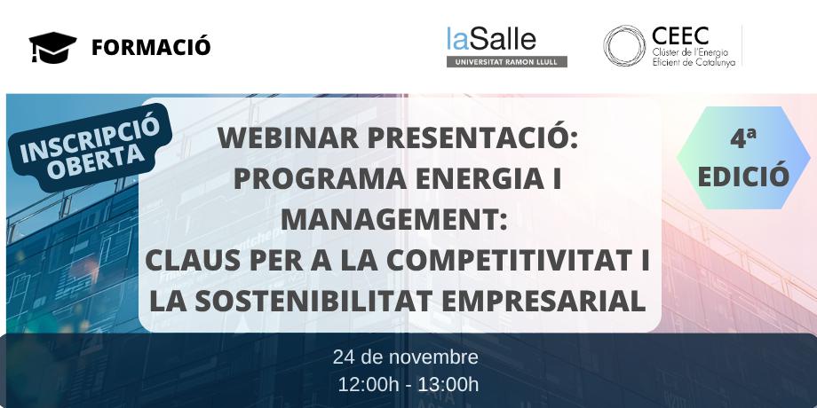 Un any més, el Clúster de l’Energia Eficient de Catalunya (CEEC) i La Salle Campus Barcelona – Universitat Ramon Llull col·laborem en el disseny del Programa formatiu “Energia i Management: claus per a la competitivitat i la sostenibilitat empresarial”, que enguany arriba a la seva quarta edició.