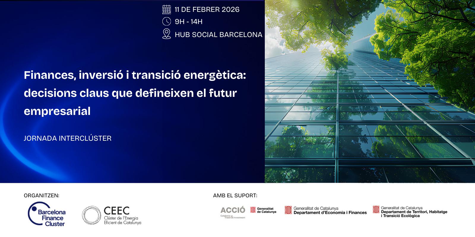 El pròxim 11 de febrer, el Barcelona Finance Cluster (BFC) i el CEEC unim forces per primera vegada en una jornada estratègica que situarà les finances com a motor del creixement empresarial i palanca clau per accelerar la transició energètica a Catalunya, i que tindrà lloc al Hub Social de Barcelona.