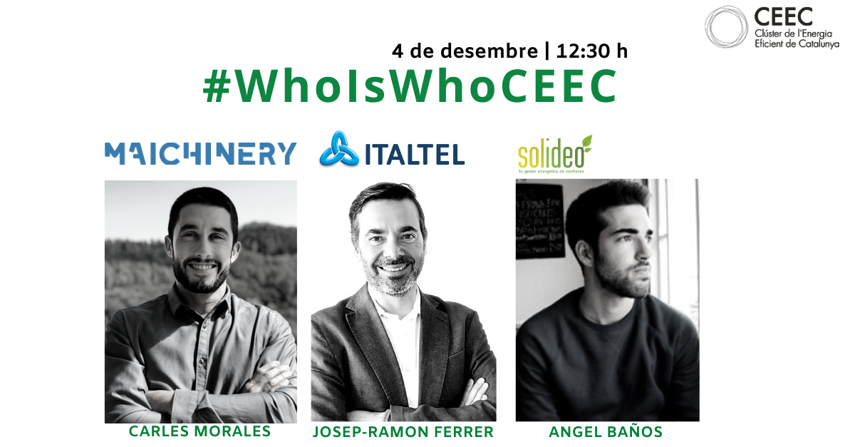 En l'últim 'Who Is Who CEEC' de 2020 comptarem amb la participació d'en Josep Ramon Ferrer, d'Italtel, l'Angel Baños, de Solideo Eco Systems i en Carles Morales de Maichinery. Aquest cop el webinar té un caràcter transversal a través del qual podrem observar formes de treballar d'empreses dels sectors de les TIC, IA i fotovoltaic.